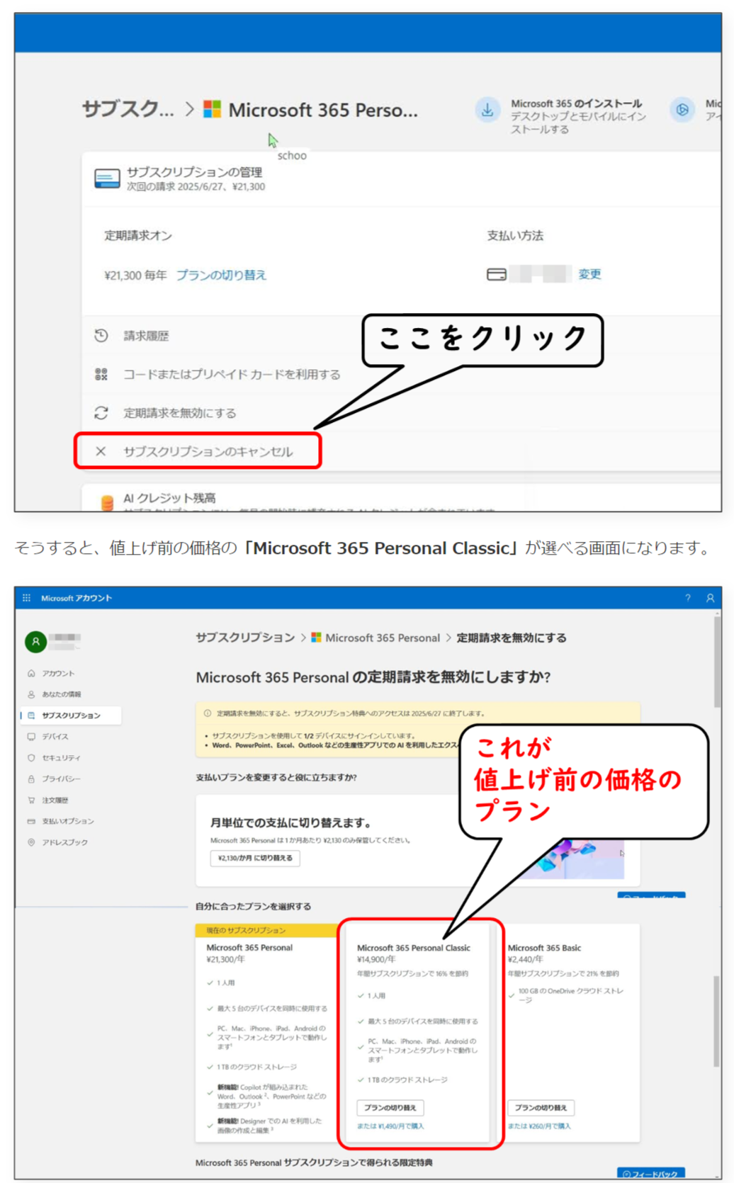 下記の図のように表示されていましたら「サブスクリプションのキャンセル」を押すと14900円のプランが出てきます。
