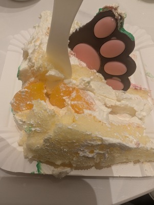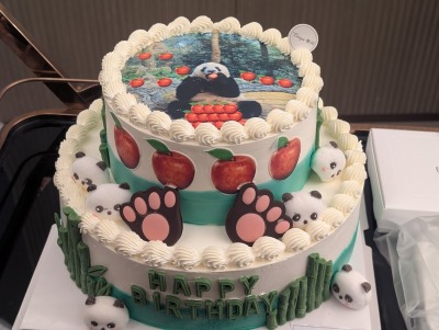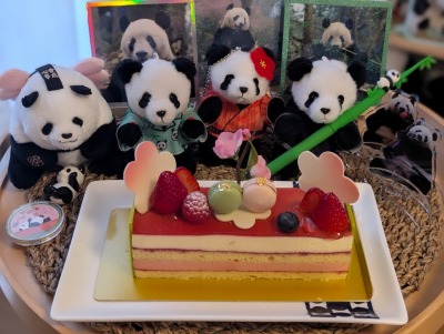 シャンシャンの子供の頃からを映像を見ながら、みなさんで持ち寄ったシャンシャングッズと一緒に写真を撮ったり、四川料理を堪能した後、ツアーで用意してくれたケーキをいただきました。
