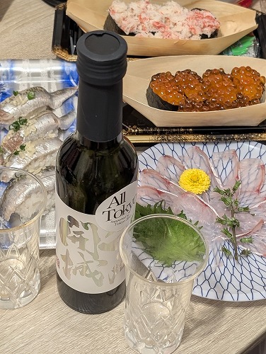 東京港区のオフィスビルで作っている日本酒にお寿司とホウボウのお刺身を合わせてみました。
