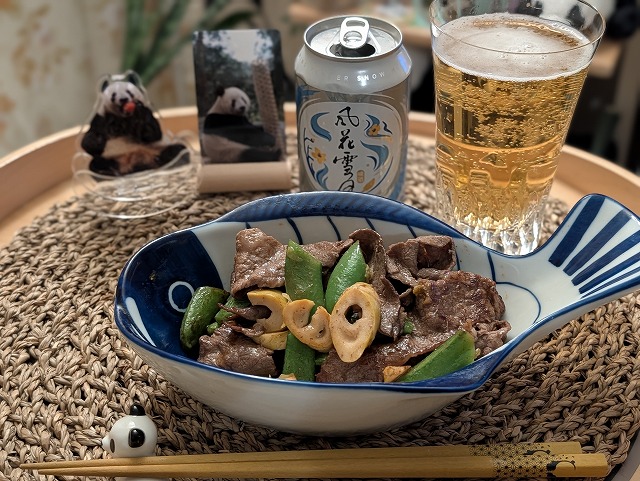 シャンシャンのツアーでいただいた、味付けタケノコをお肉と炒めて食べてみました。