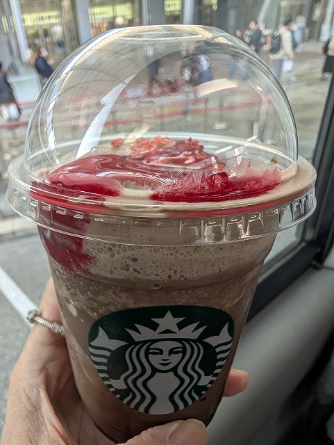 スタバのビター カカオ & ストロベリー ムース フラペチーノがモバイルオーダーだと今だけエスプレッソショットが無料でした。